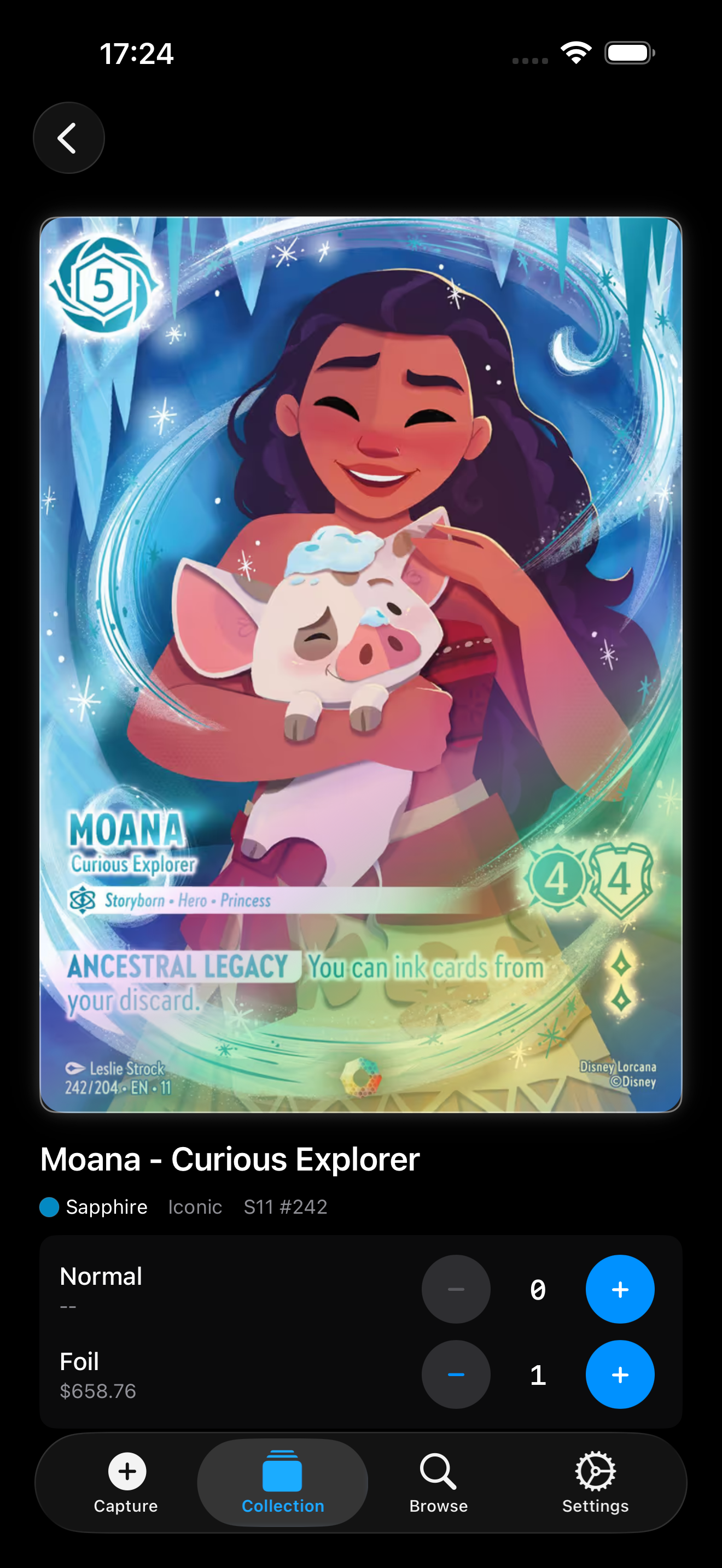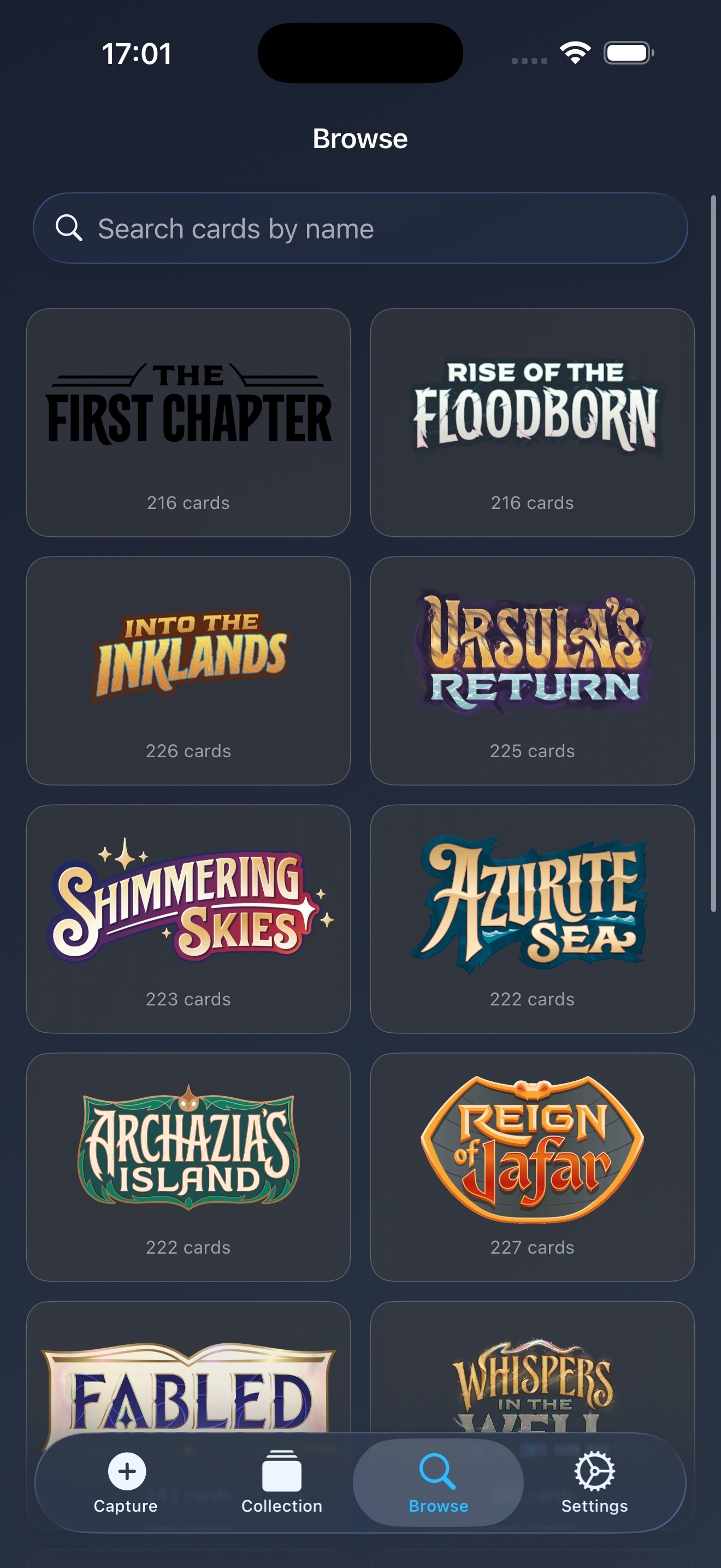 Browse the full catalogue — sets, starter decks, promos. Collection browser supports multiple views and filters.