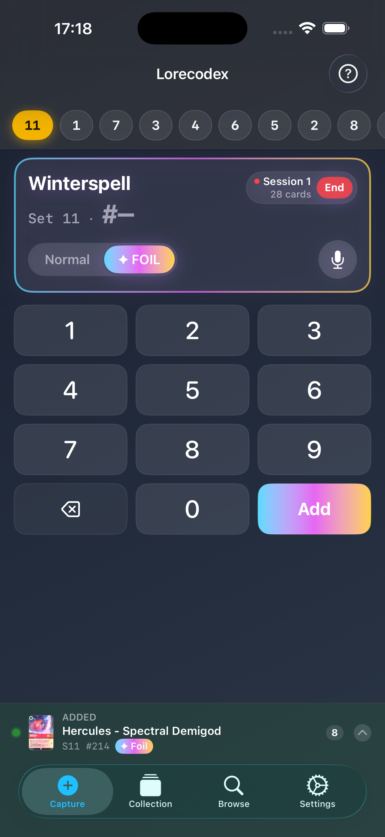 Two separate selectors so you don't need to pre-sort. Pick a set once, thumb card numbers. Normal or foil, one tap.
