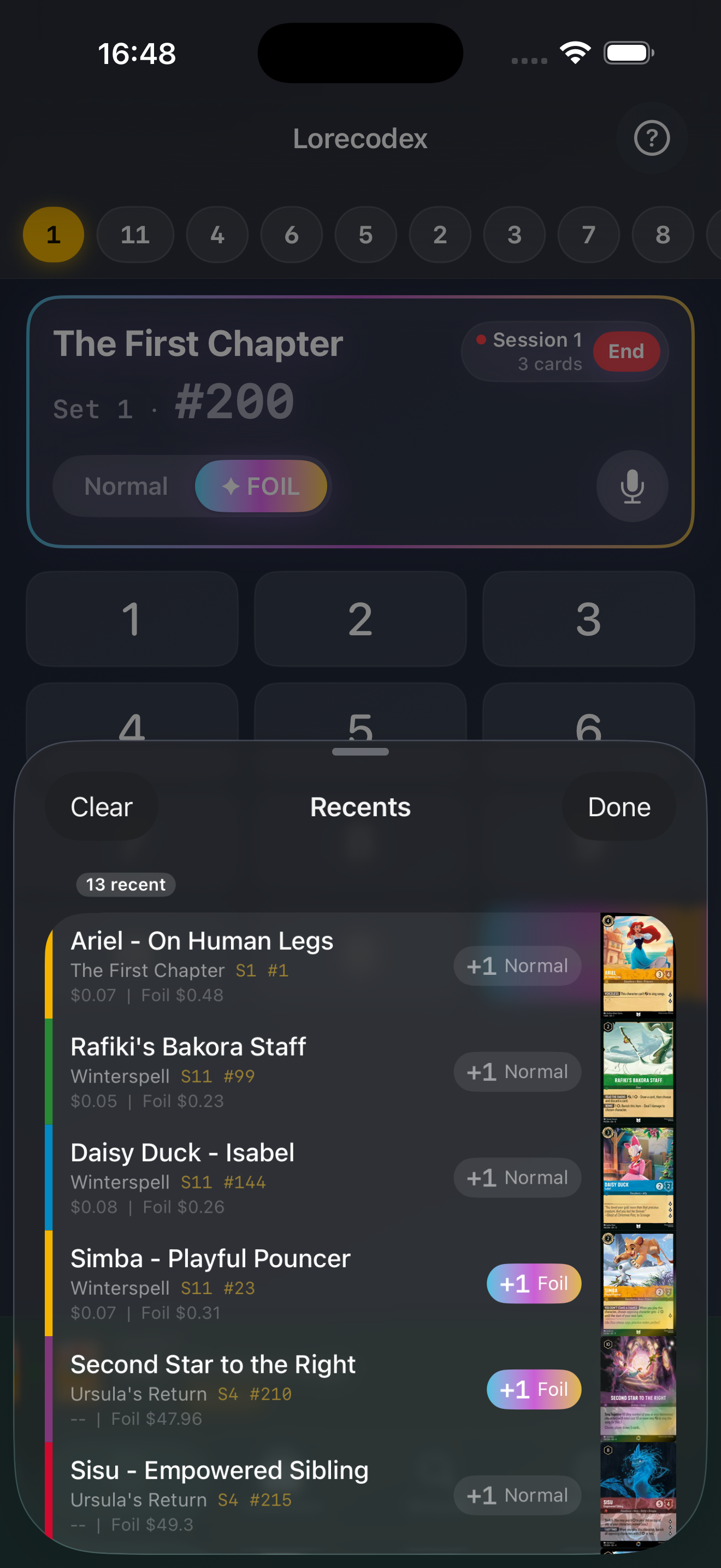 Lorecodex is a small, private iOS companion to the Lorcana tools you already love. Log what you pull without sorting first, open new packs in a Session, and export just the new cards — no duplicating your collection in Dreamborn.